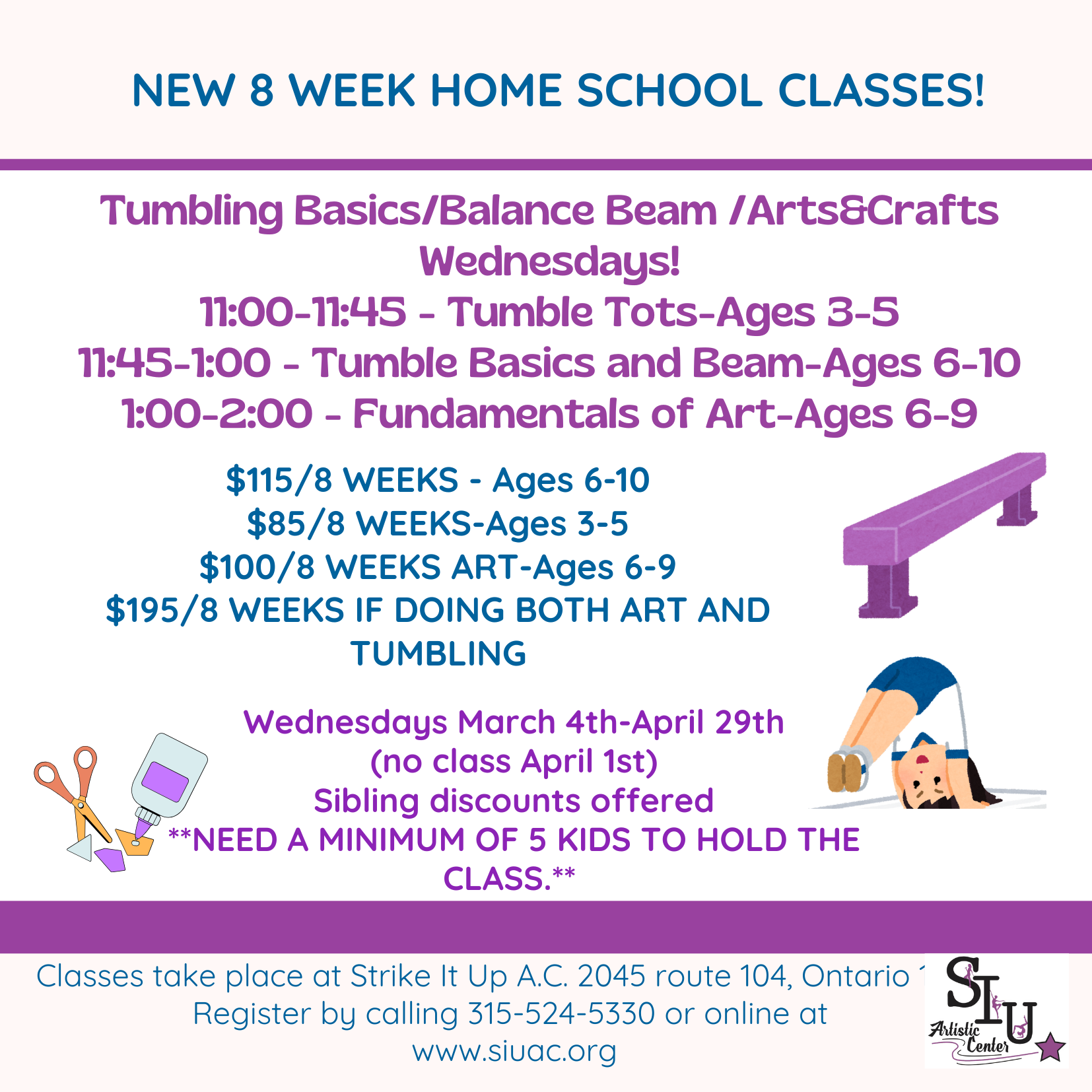 Strike It Up Artistic Center offers 8-week homeschool sessions designed to build coordination, confidence, creativity, and social skills β all in a supportive, fun environment.